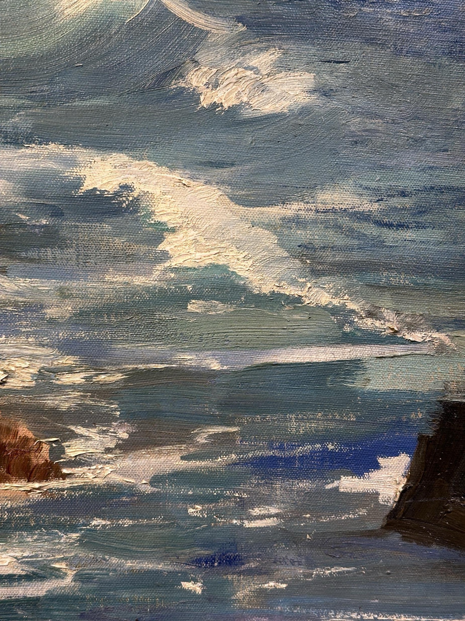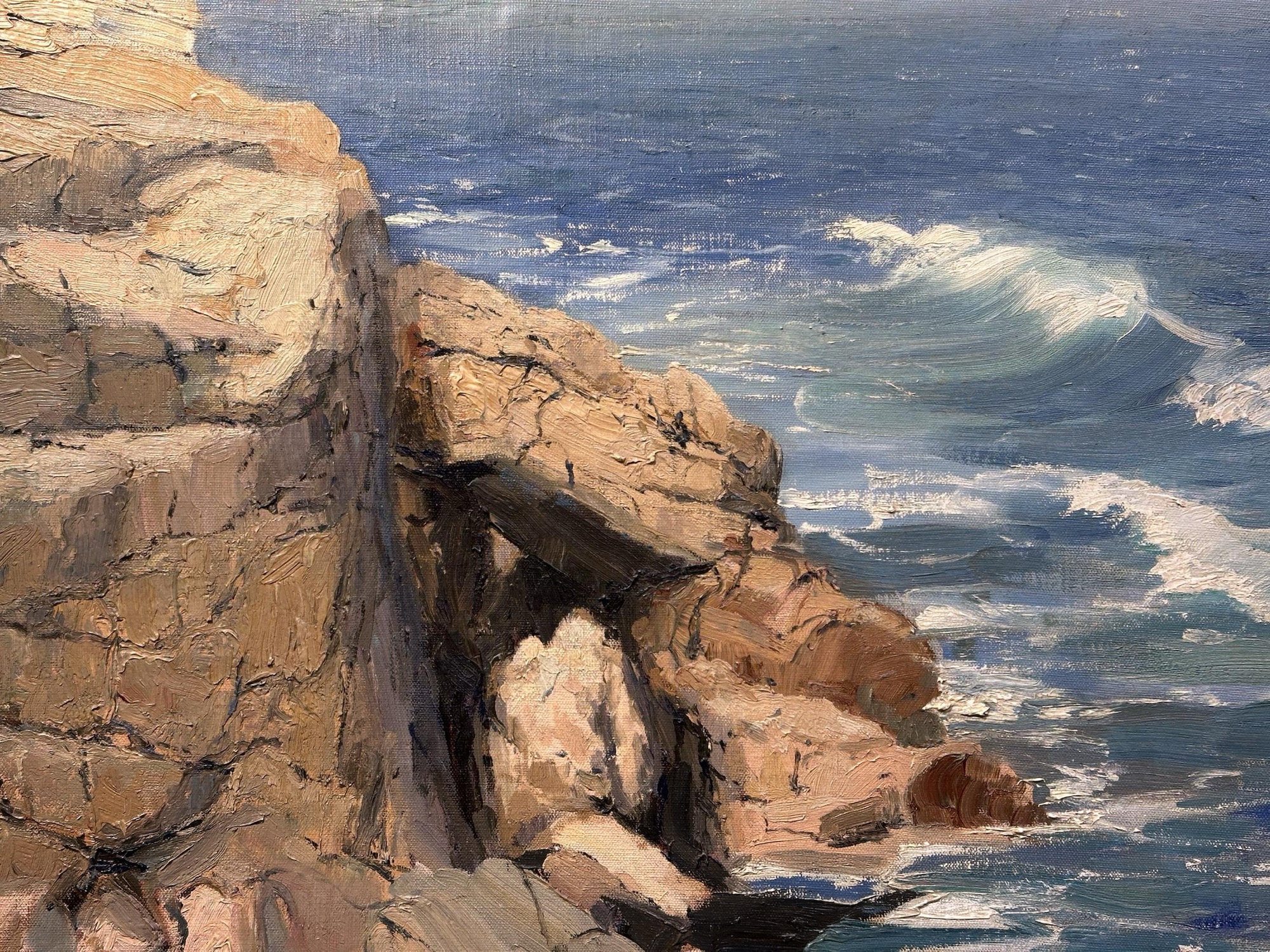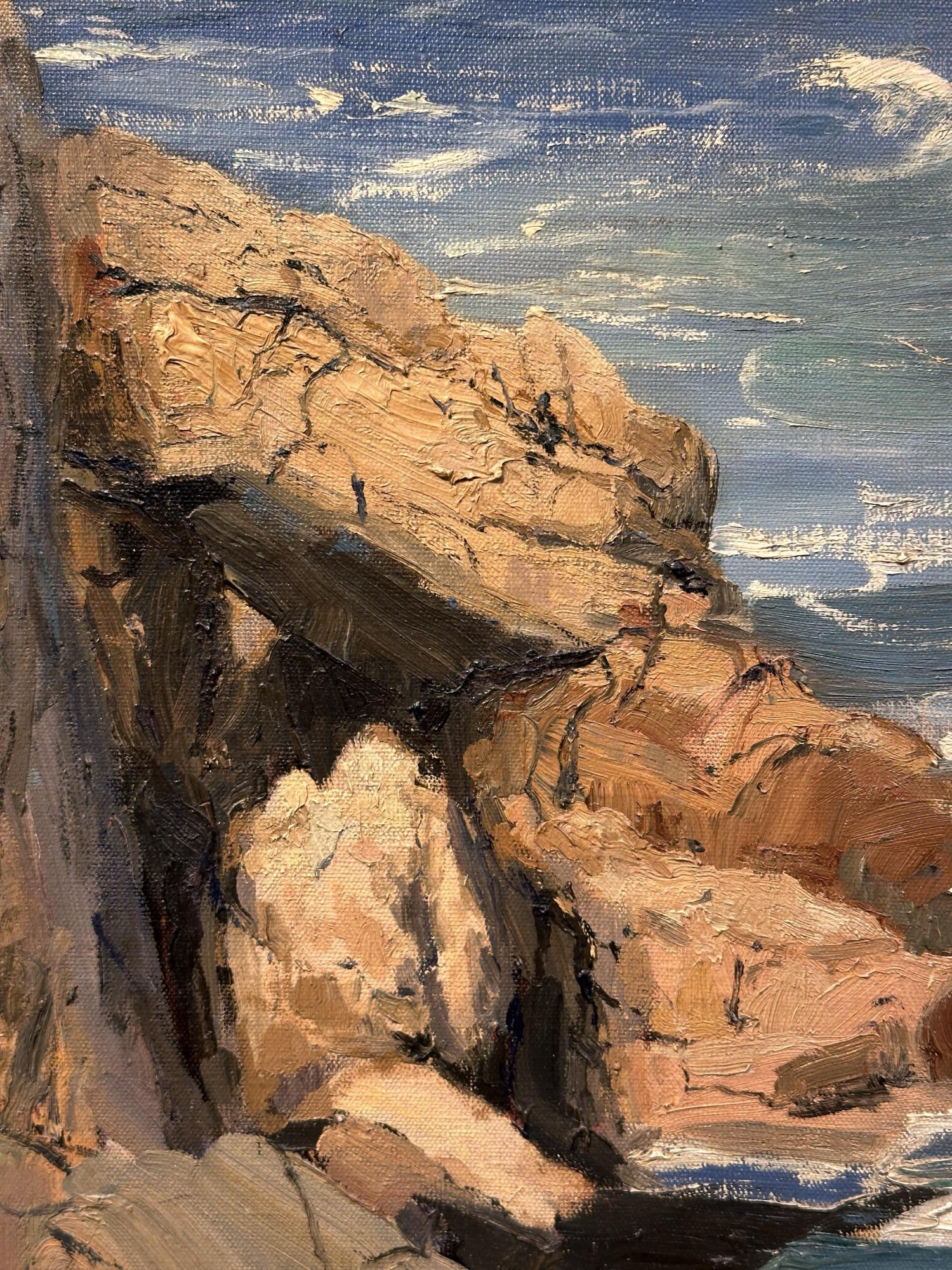 Gaul, closely associated with the Provincetown art colony, was renowned for her marine subjects and her ability to convey atmosphere with economy of means. Here, his brushwork is vigorous and direct. Thick passages of impasto articulate the chalky surfaces of the rock face, while broader, fluid strokes describe the shifting blues and greens of the water. The restrained palette-cool sea tones set against warm, sunlit stone-creates a harmonious balance characteristic of mid-century American Impressionism.