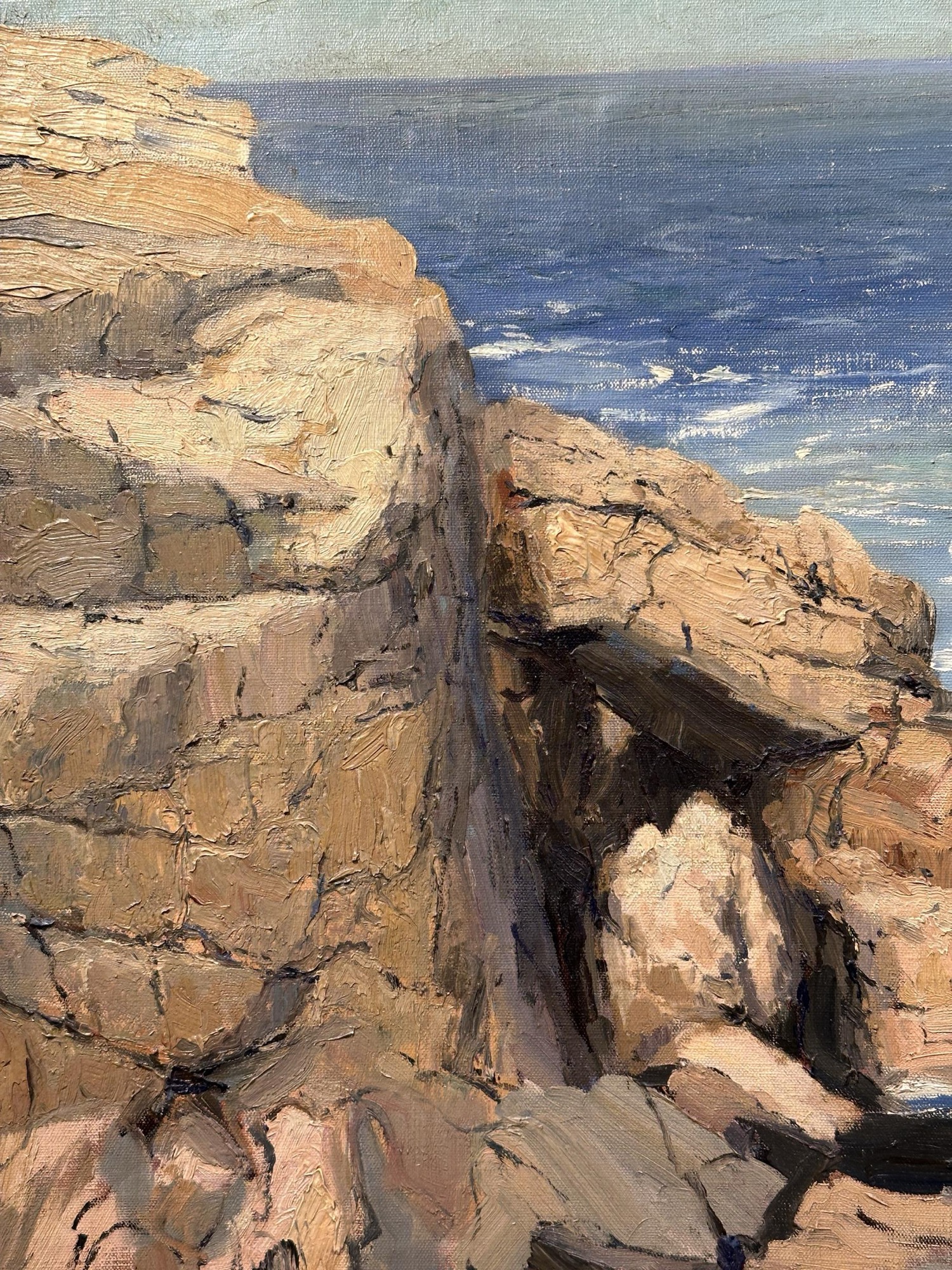 A luminous and confidently handled coastal study by Arrah Lee Gaul, this painting captures the elemental drama of sea and stone with remarkable immediacy. Pale, sun-struck cliffs descend sharply into a restless Atlantic swell, the surface of the water animated by curling waves and scattered foam. The composition is simple yet powerful: a strong vertical mass of rock to the left counterbalanced by the open horizon and rhythmic movement of the sea to the right.