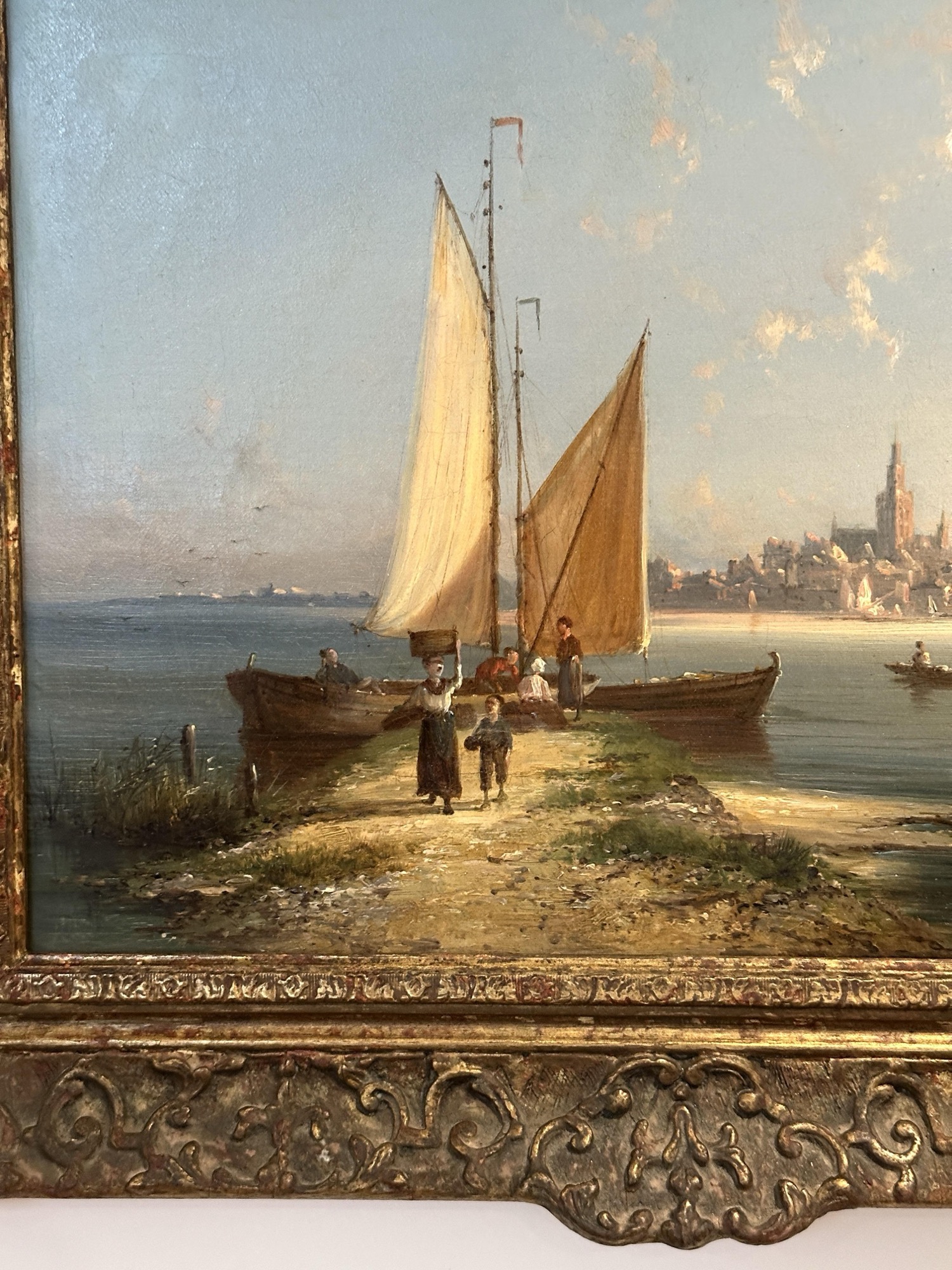 Dommersen was especially admired for his ability to combine marine painting with picturesque townscape, and that talent is clearly evident here. The calm expanse of water, broken only by small rowing craft and soft reflections, is handled with confidence and sensitivity. The tall sails provide a strong vertical accent within the composition, while the clear sky and silvery light create the serene, luminous quality so closely associated with the Dutch maritime tradition.