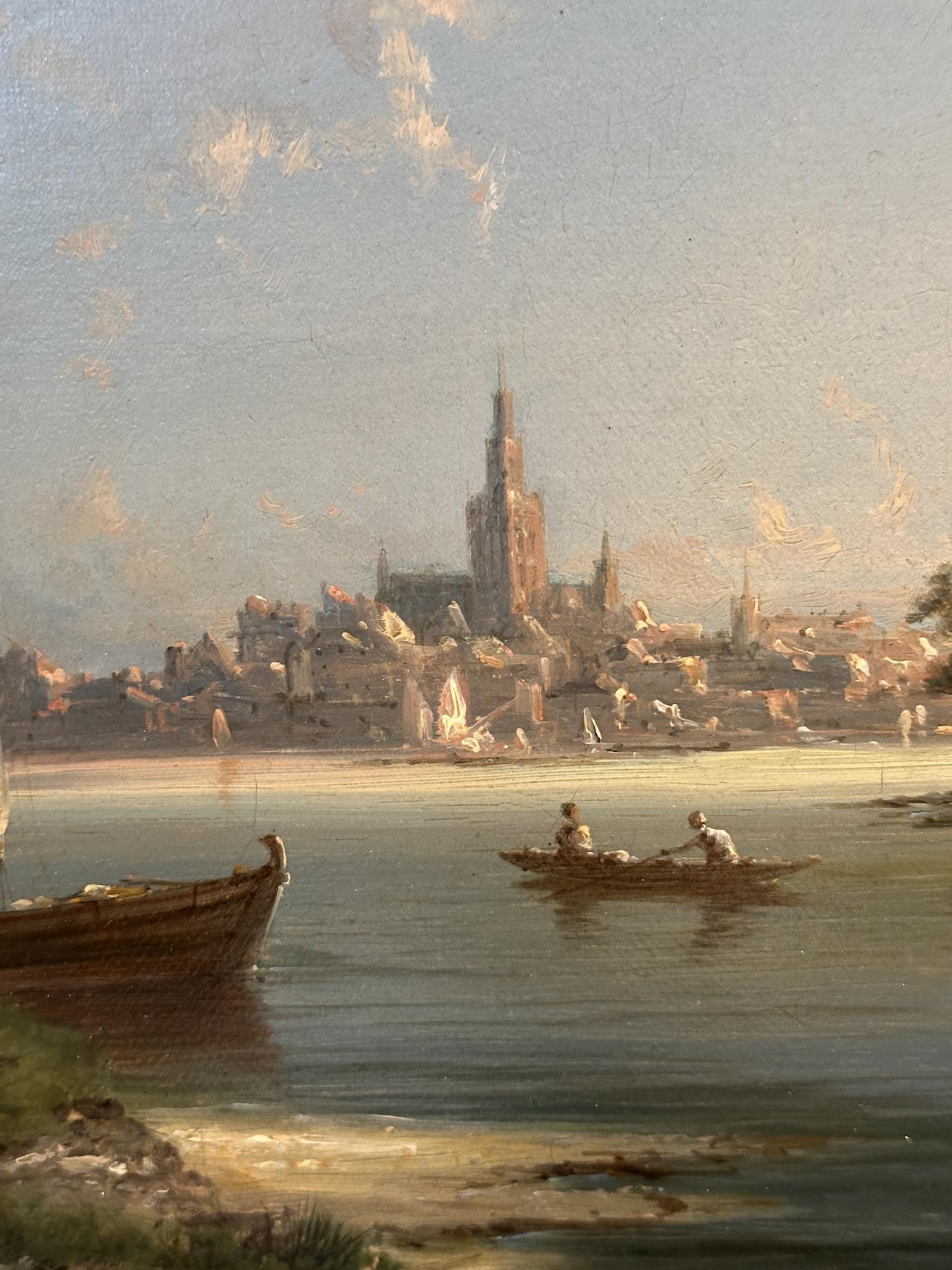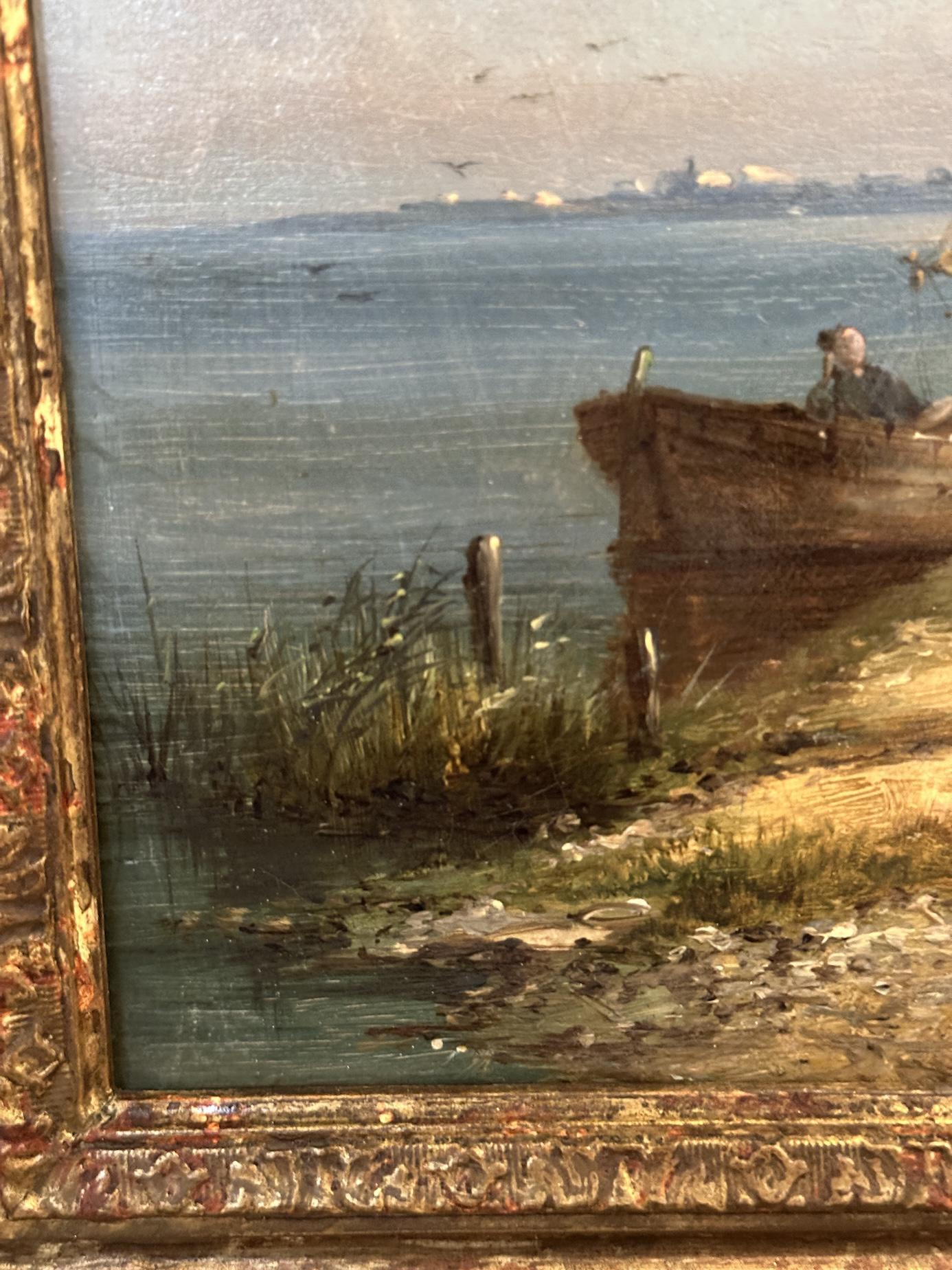 The painting is pleasingly balanced, with the intimate foreground activity leading the eye naturally toward the distant town. It is a work that possesses both decorative appeal and genuine period character, evoking the quiet industry and enduring beauty of 19th-century Holland's waterways and fishing communities.